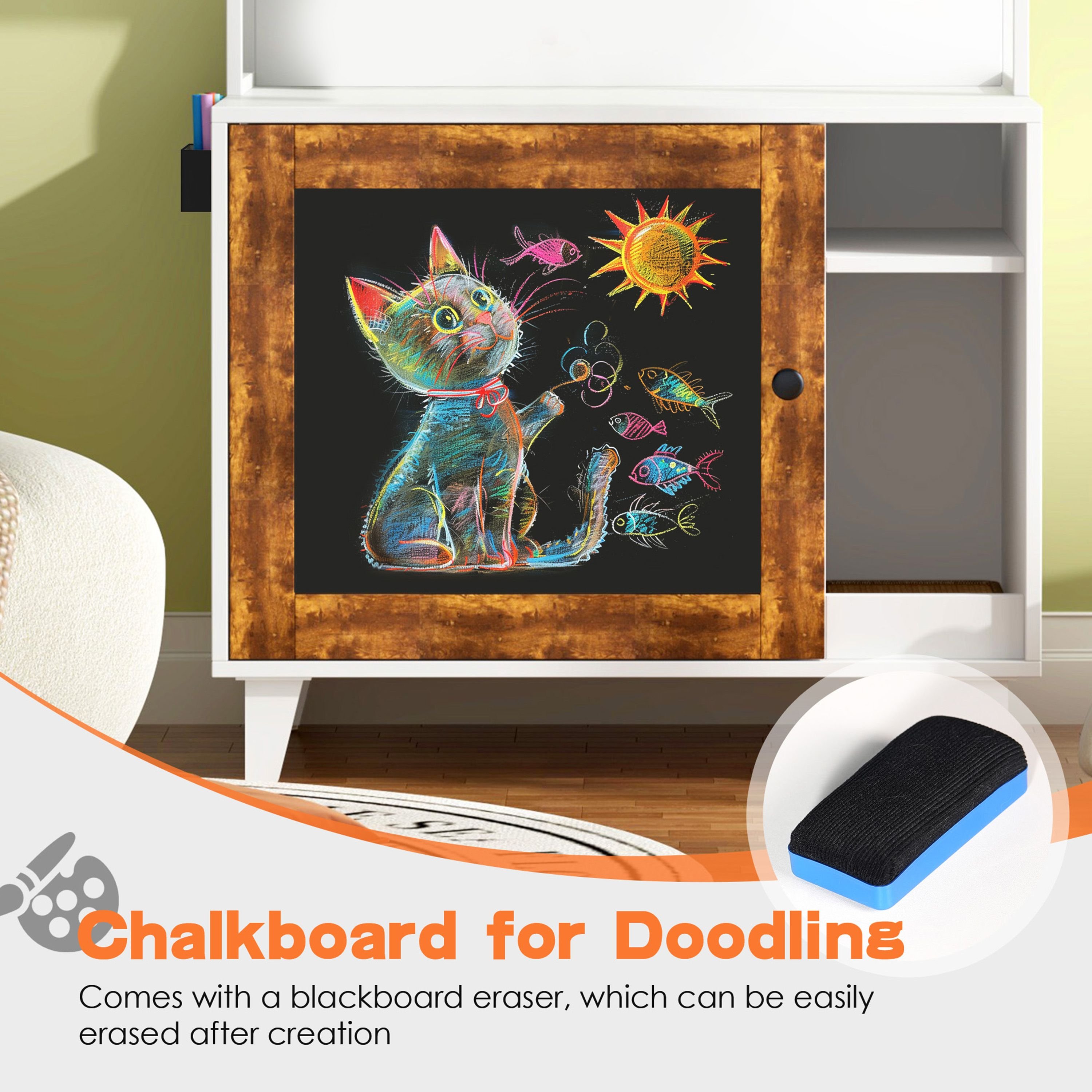 4.Chalkboard Doors: Add a personal touch by writing or drawing on the blackboard doors, whether it’s your cat’s birthday or feeding reminders.