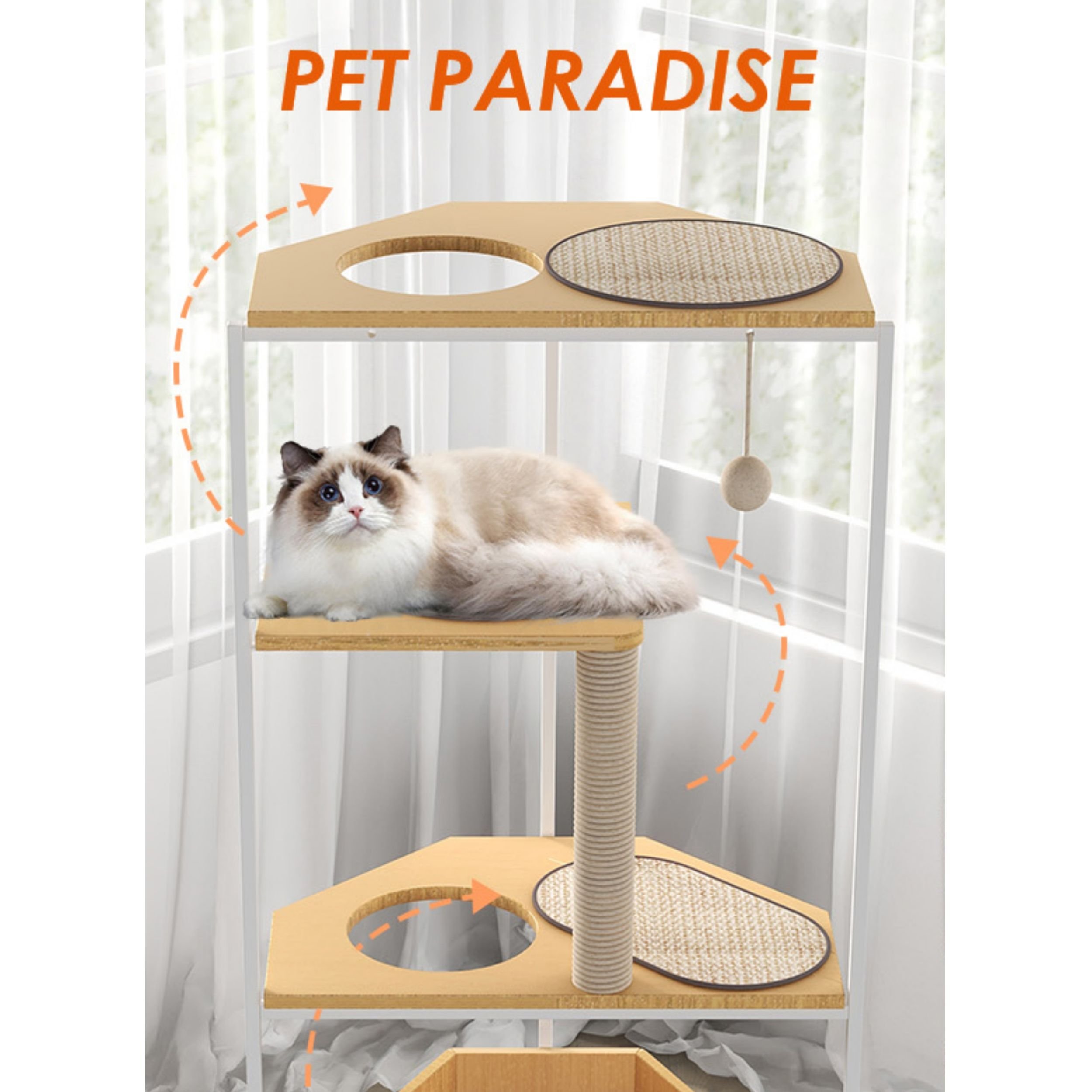 2.Space-Saving Corner Design: With a clever corner-friendly design, this cat tower maximizes floor space, making it ideal for smaller homes and apartments without sacrificing space for your cat's enjoyment.